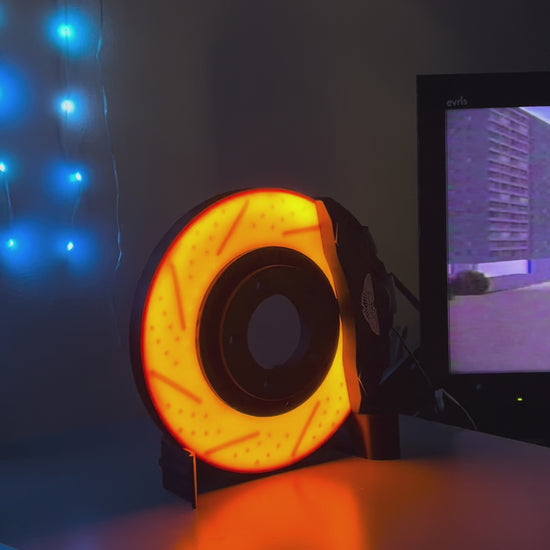 The Brake Disc Lamp is a bold fusion of engineering and design. Inspired by high-performance braking systems, this piece is hand made with precision and fitted with vibrant LED lighting to create an atmosphere that turns heads — even when parked.