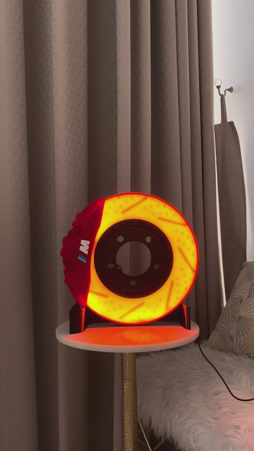 The Brake Disc Lamp is a bold fusion of engineering and design. Inspired by high-performance braking systems, this piece is hand made with precision and fitted with vibrant LED lighting to create an atmosphere that turns heads even when parked.